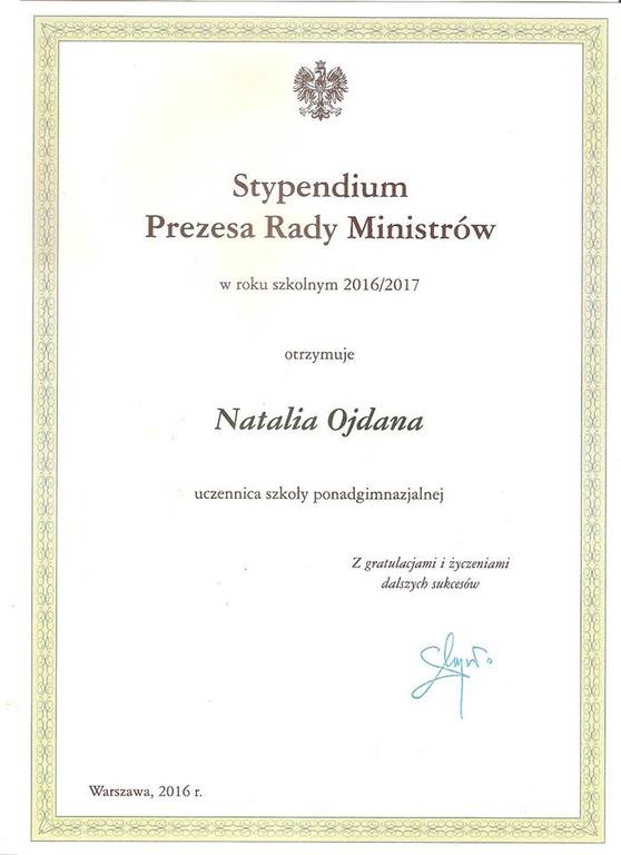 Stypendium Prezesa Rady Ministrów dla naszej uczennicy!