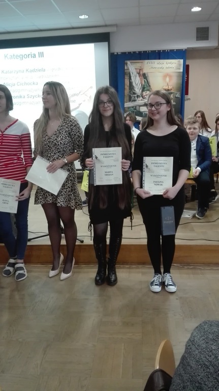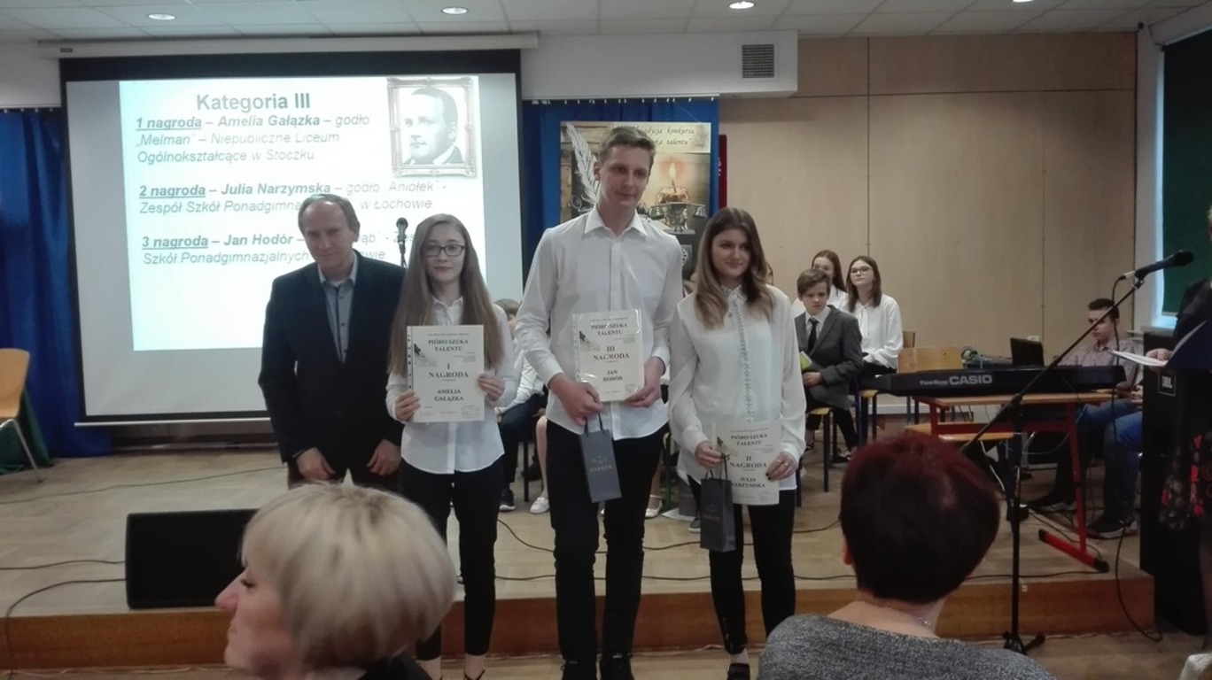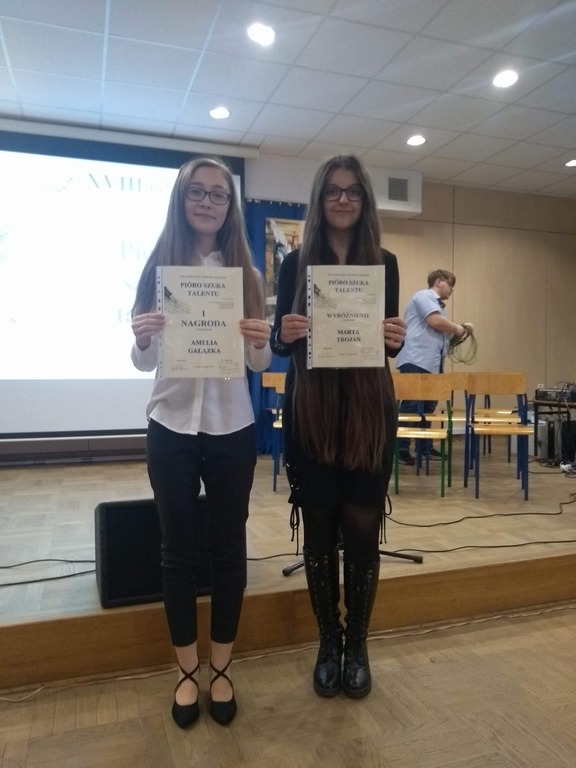 W dniu 21.02.2019 r. odbyło się rozstrzygnięcie XVIII edycji Powiatowego Konkursu Literackiego „Pióro szuka talentu”. W konkursie brali udział uczniowie wszystkich typów szkół. Wśród nagrodzonych nie zabrakło uczennic naszego liceum. W kategorii proza szkół ponadgimnazjalnych I miejsce zajęła Amelia Gałązka z klasy I, a w kategorii poezji wyróżniona została Marta Trojan, również z klasy I.
