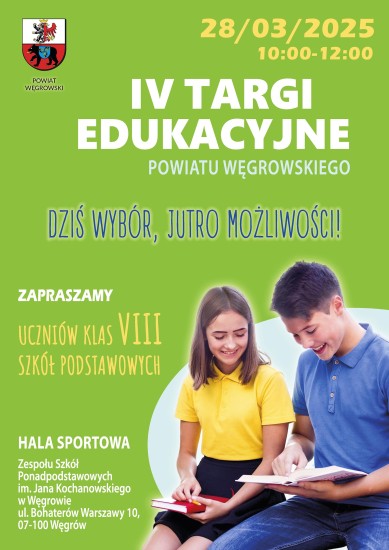 Zapraszamy na IV Targi Edukacyjne Powiatu Węgrowskiego, które odbędą się 28 marca 2025 roku. Wyjatkowe wydarzenie skierowane do uczniów, rodziców i wszystkich zainteresowanych dalszą edukacją.
